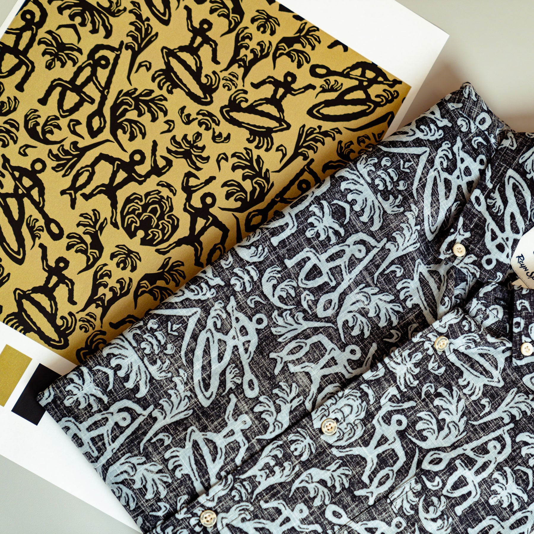Archive print, 2012. Created by the late Big Island artist Dietrich Varez, this print features Varez’s unique block print art style in a design that depicts petroglyph-like figures enjoying surfing, paddle boarding and fishing.