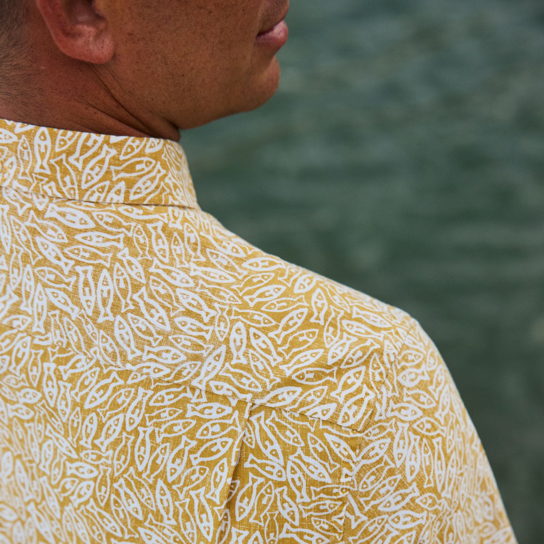 This microprint features a subtle aquatic theme. The small scale artwork ensures the fish motifs remain subtle, adding a modern, refined touch to the traditionally vibrant island style.