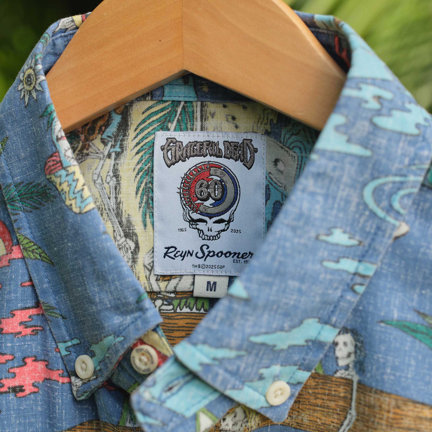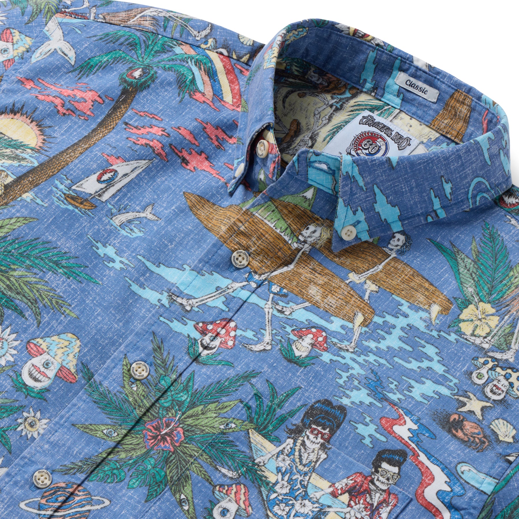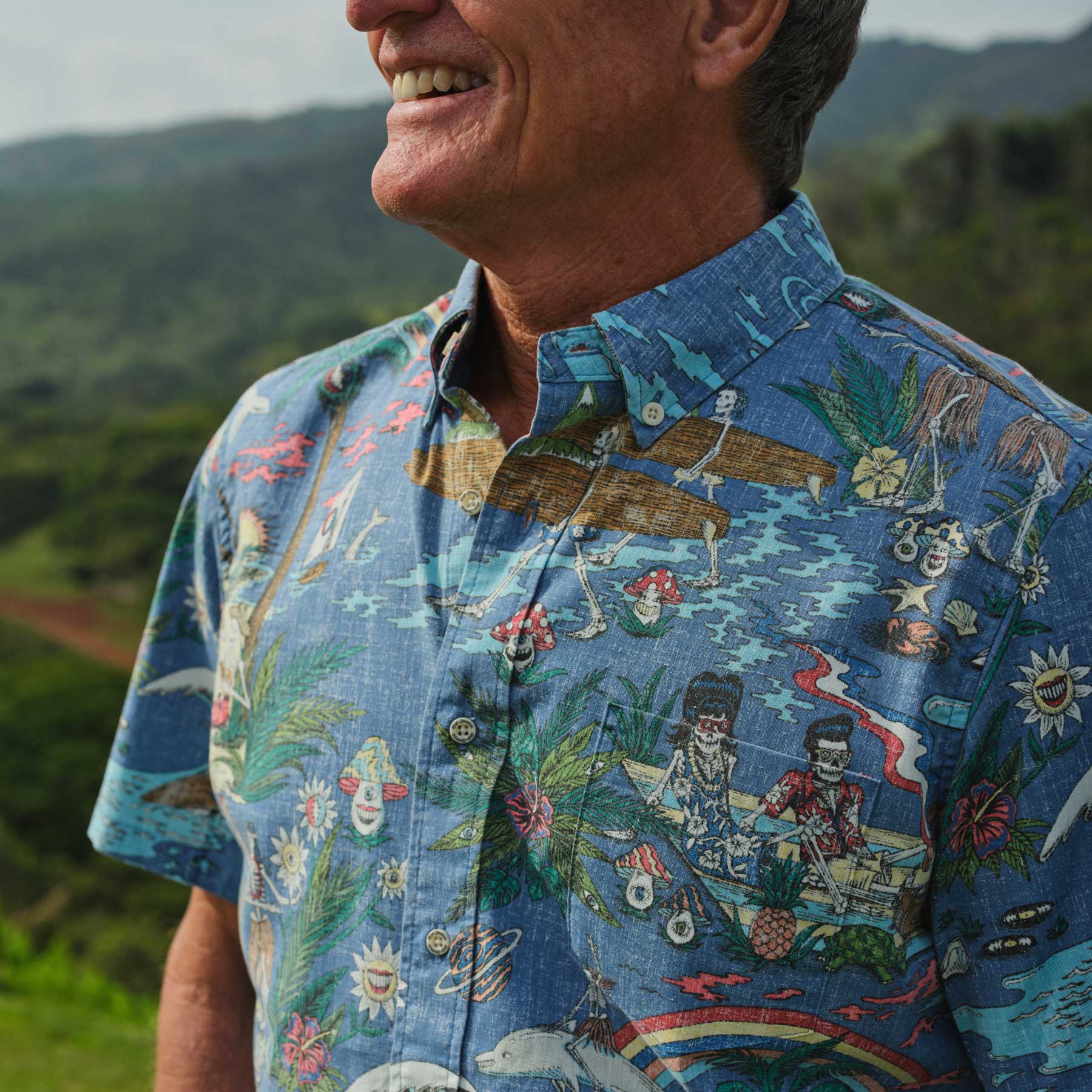 Far out! Can anyone have more fun in Paradise? Dave Van Patten is a renowned artist whose Grateful Dead album art recently won a Grammy and whose whimsical style was a fantastic fit for an aloha shirt. Dave’s signature art style focuses on turning inanimate objects into characters. For this print, Dave created a “Hawaii themed Fantasy-land in Another World” featuring UFOs, flying dolphins, surfing Bertha, and more. Travel with the Grateful Dead to an alternate tropical universe.