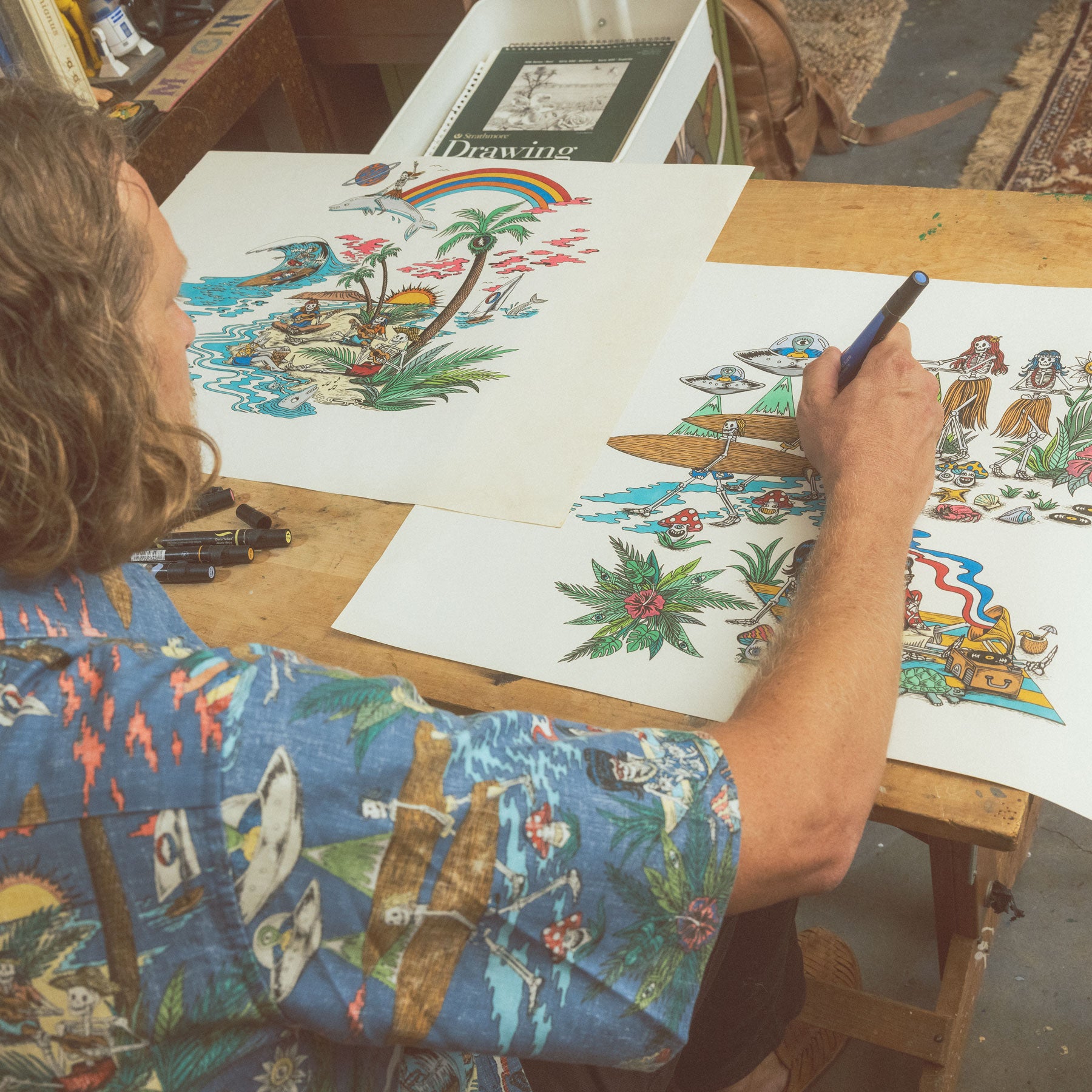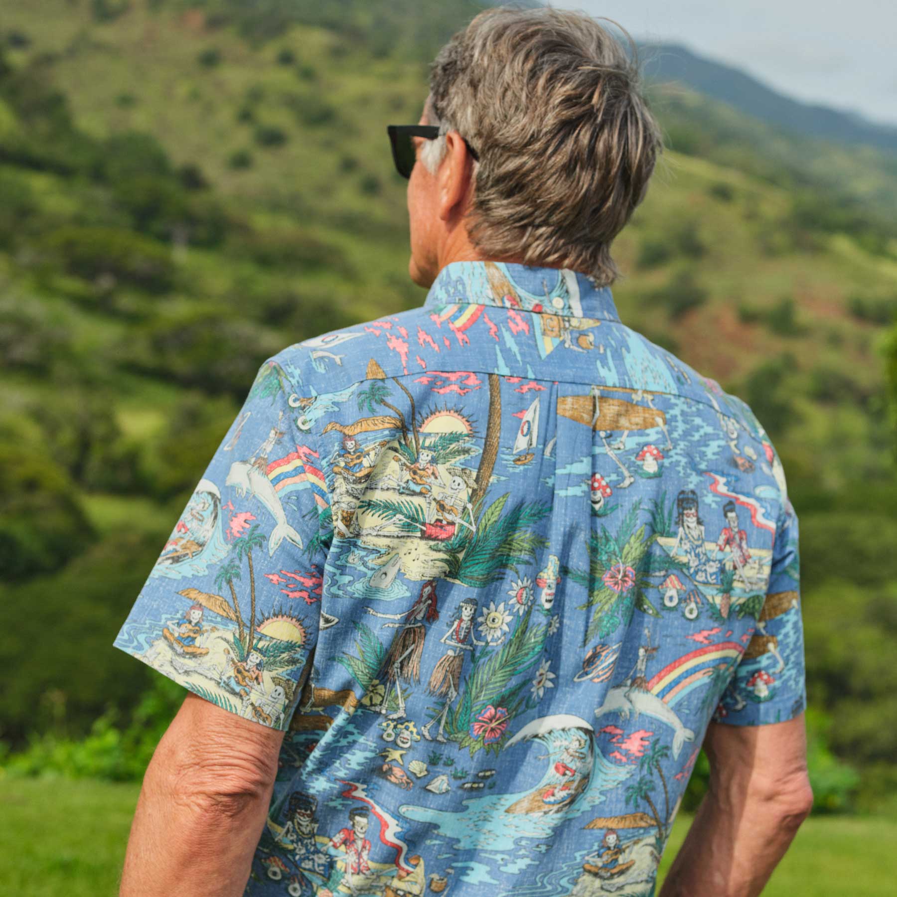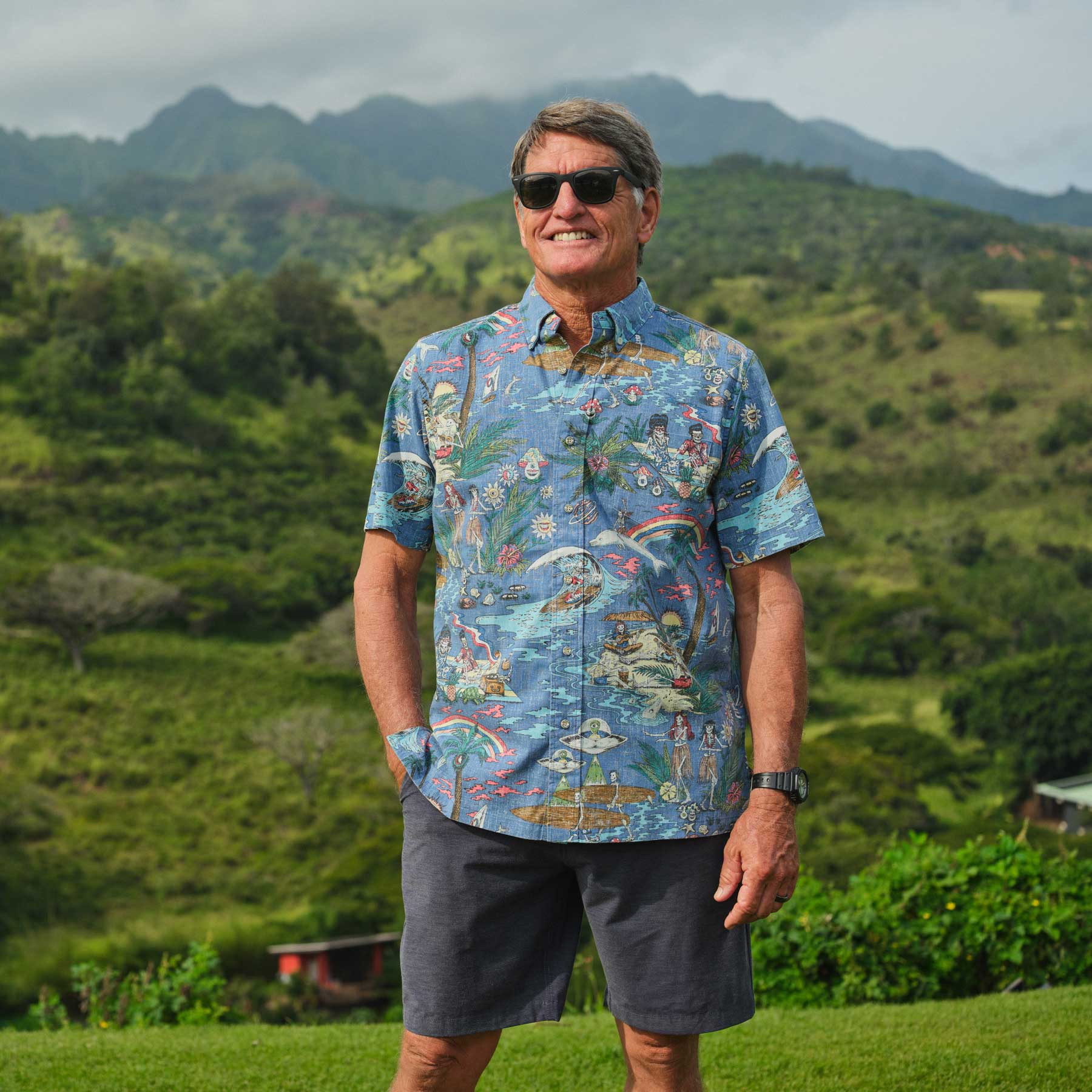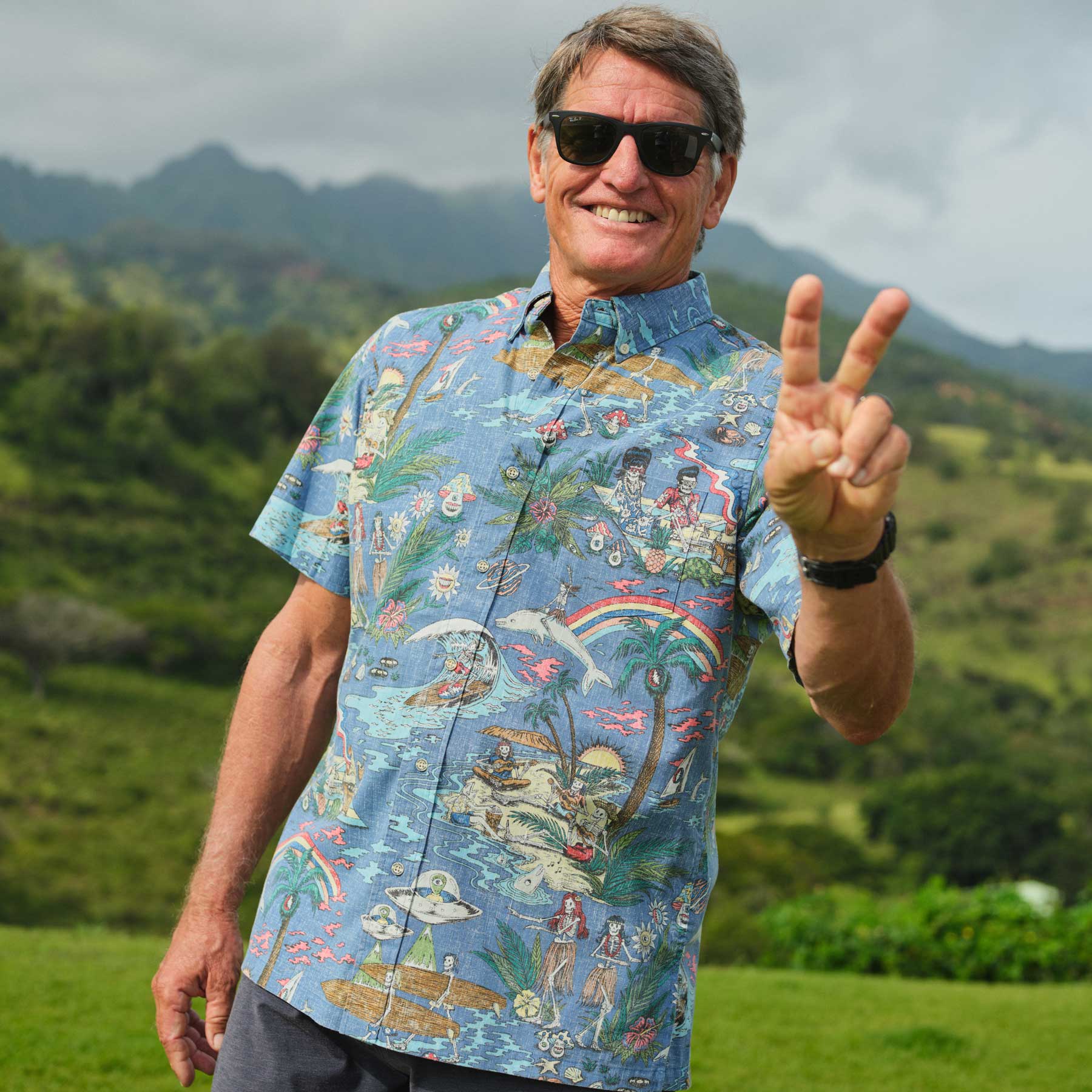 Far out! Can anyone have more fun in Paradise? Dave Van Patten is a renowned artist whose Grateful Dead album art recently won a Grammy and whose whimsical style was a fantastic fit for an aloha shirt. Dave’s signature art style focuses on turning inanimate objects into characters. For this print, Dave created a “Hawaii themed Fantasy-land in Another World” featuring UFOs, flying dolphins, surfing Bertha, and more. Travel with the Grateful Dead to an alternate tropical universe.