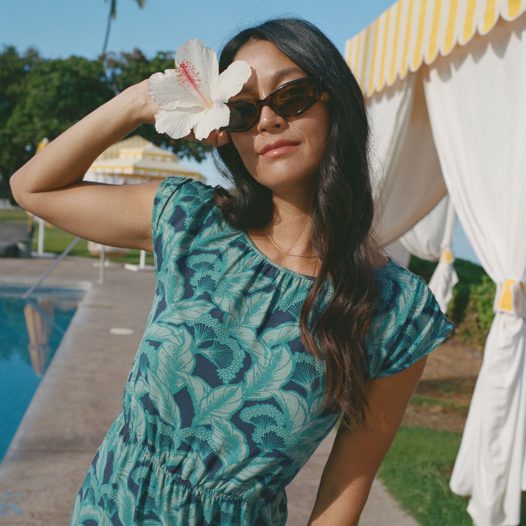 The Hihi'o Rosy Dress is a shirred maxi crafted from a soft rayon blend with just the right amount of stretch. A relaxed fit and bra-friendly wide neckline keep it easy, while delicate shirring at the shoulders adds a touch of texture. The channeled elastic waist flatters with adjustable comfort, and inseam pockets bring everyday ease to this flowy, cap-sleeve silhouette.