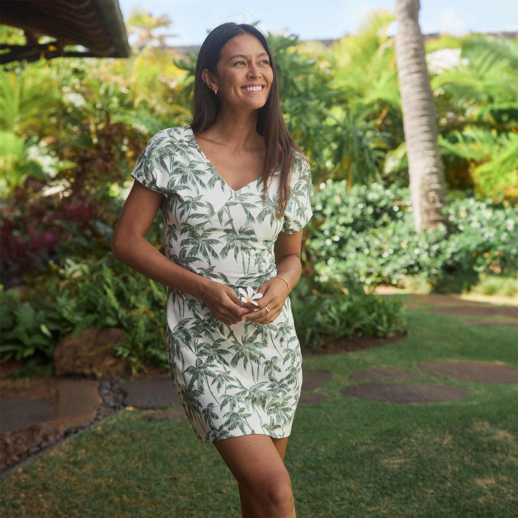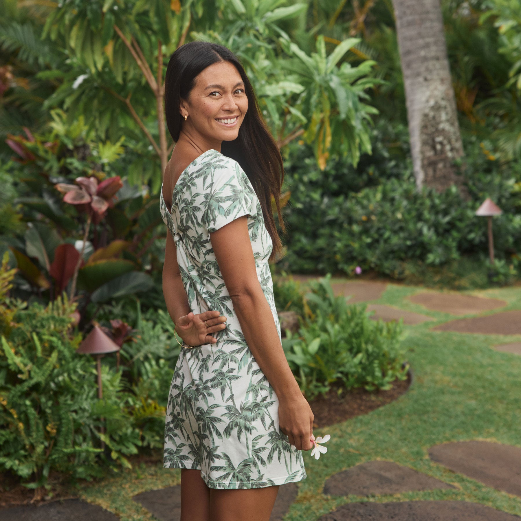 Archive print, 2016. Our Dreamy Palms Zoey Dress falls above the knee and has an easy, relaxed fit with V-neckline. The back has a romantic twist detail with small cutouts.