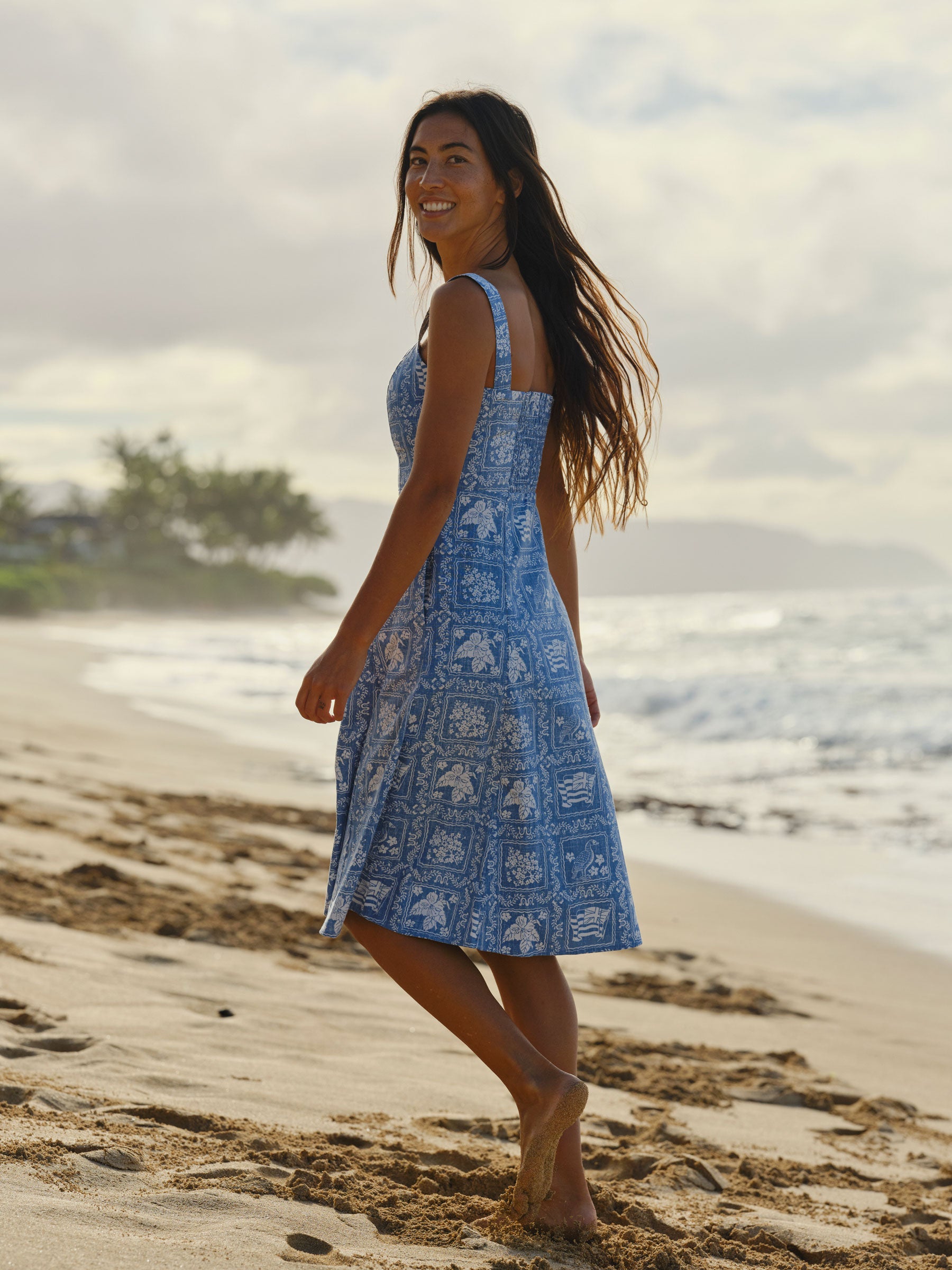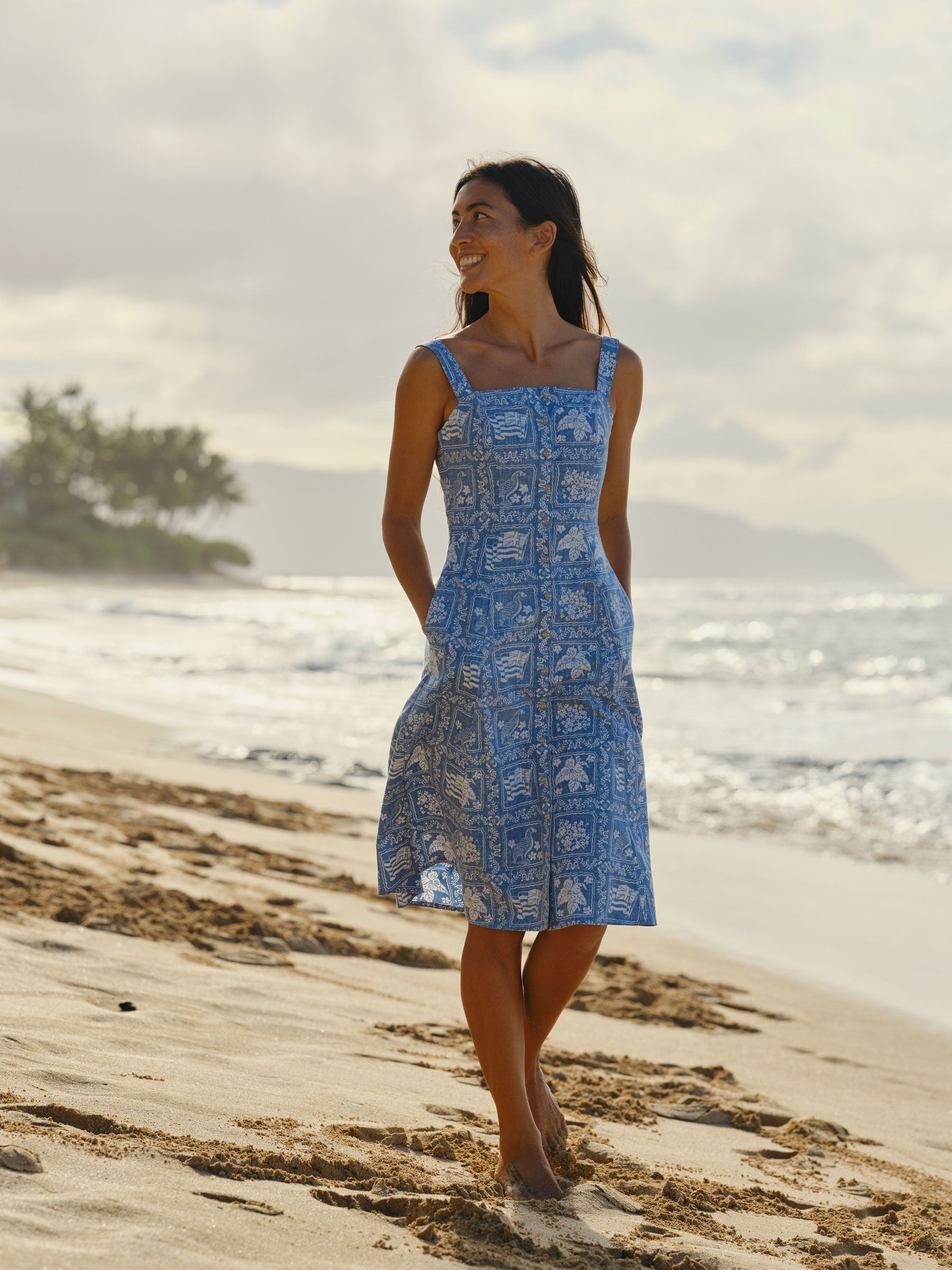 Our women's Lahaina Sailor Riley Dress features a fitted bodice with smocking across the back for ease of wear. With button front closure, A-line skirt shape, and inseam pockets, this classic dress is perfect for any occasion.