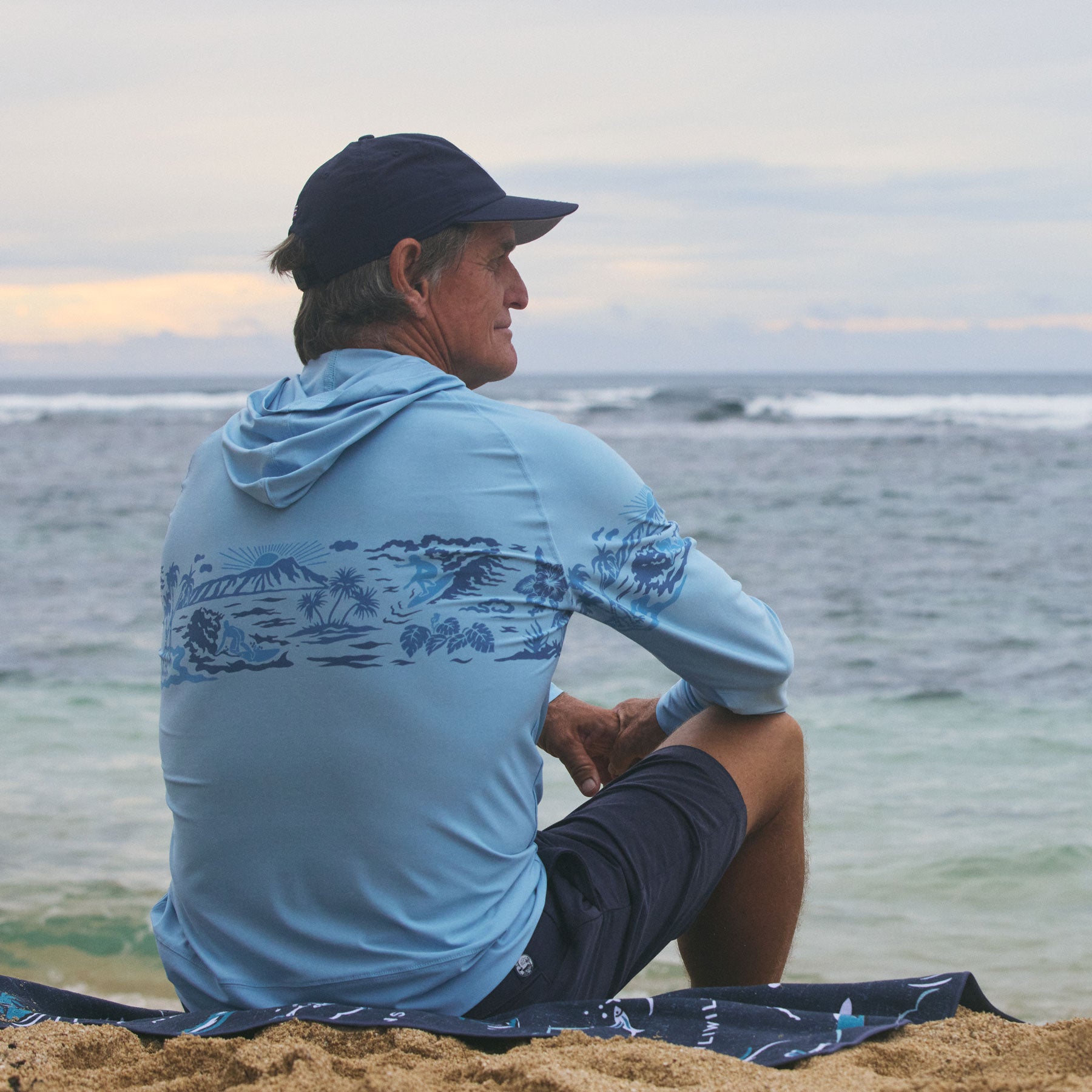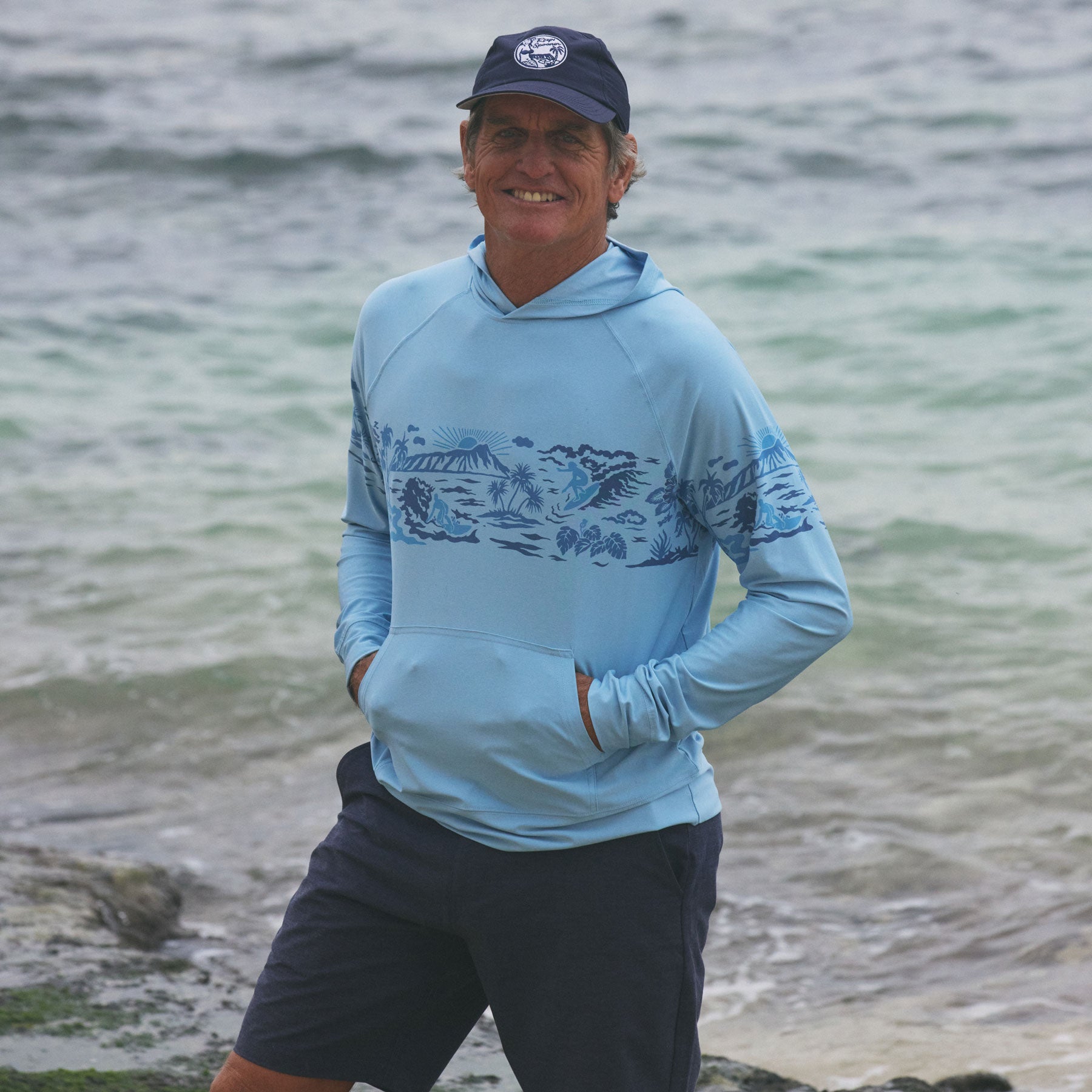 This versatile Performance Hoodie features our Waikiki Beach print which showcases the beautiful Diamond Head among surfers and palm trees.